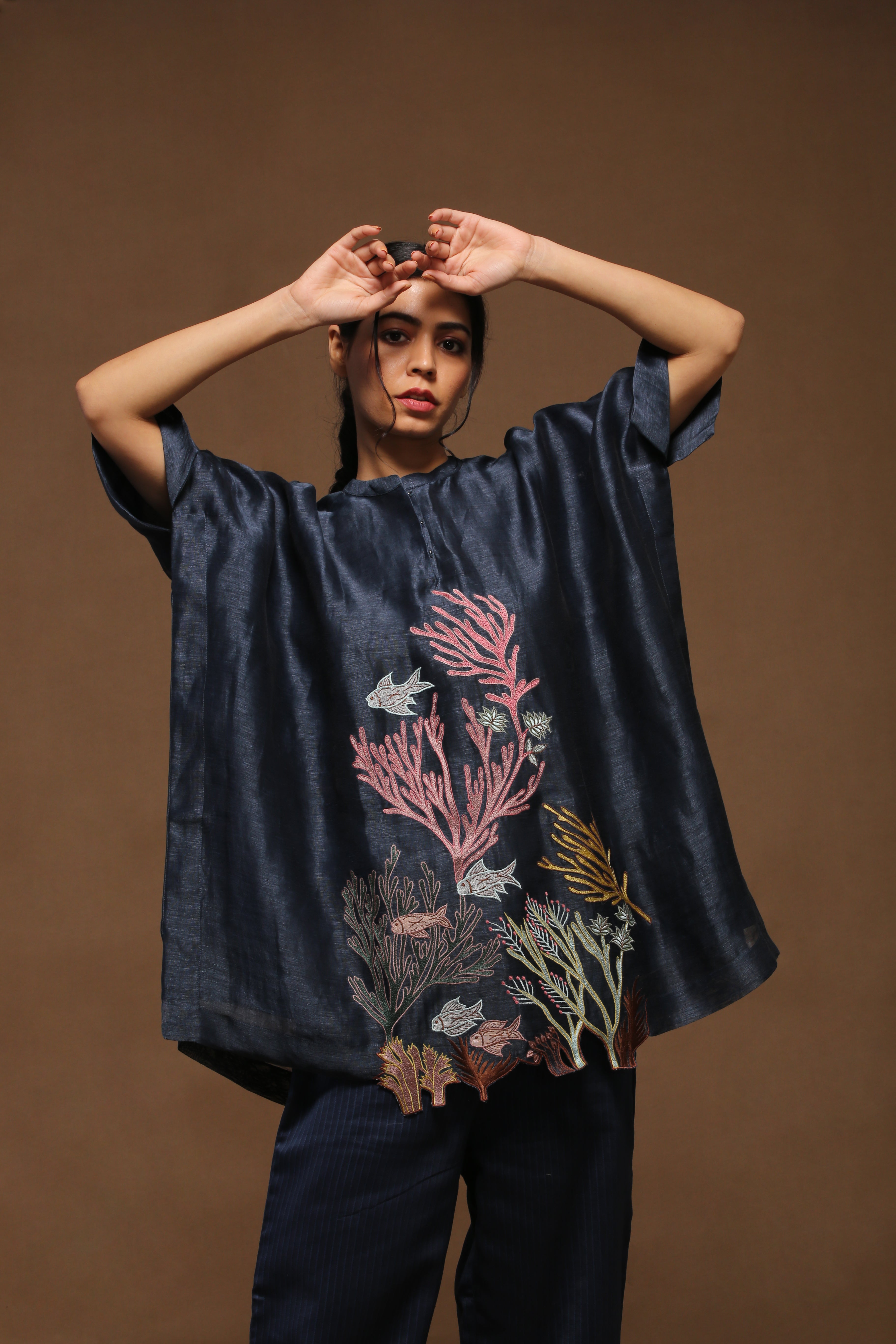 A set of three relax fit handloom linen silk kaftaan with cutwork detail, linen satin lining and parallels.