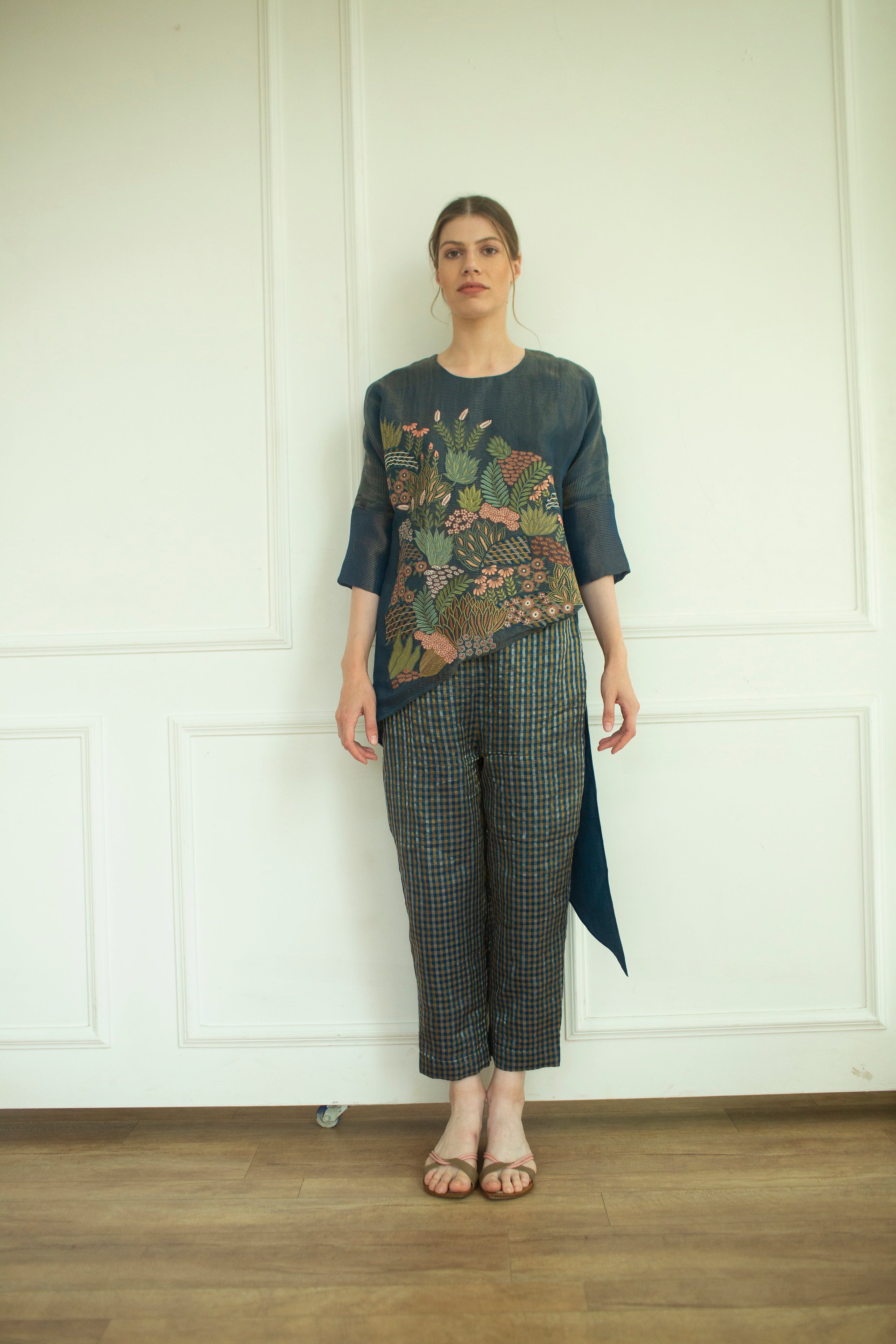 A set of two relax fit handloom silk tunic set with  hand applique embroidery details.