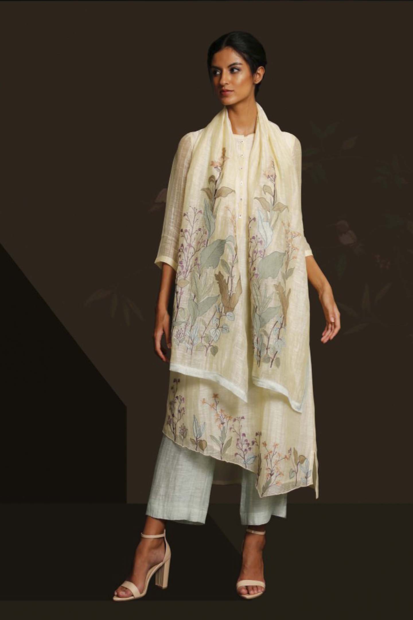 A Linen Silk 3 Pieceset with beautiful frondwork on the dupatta.