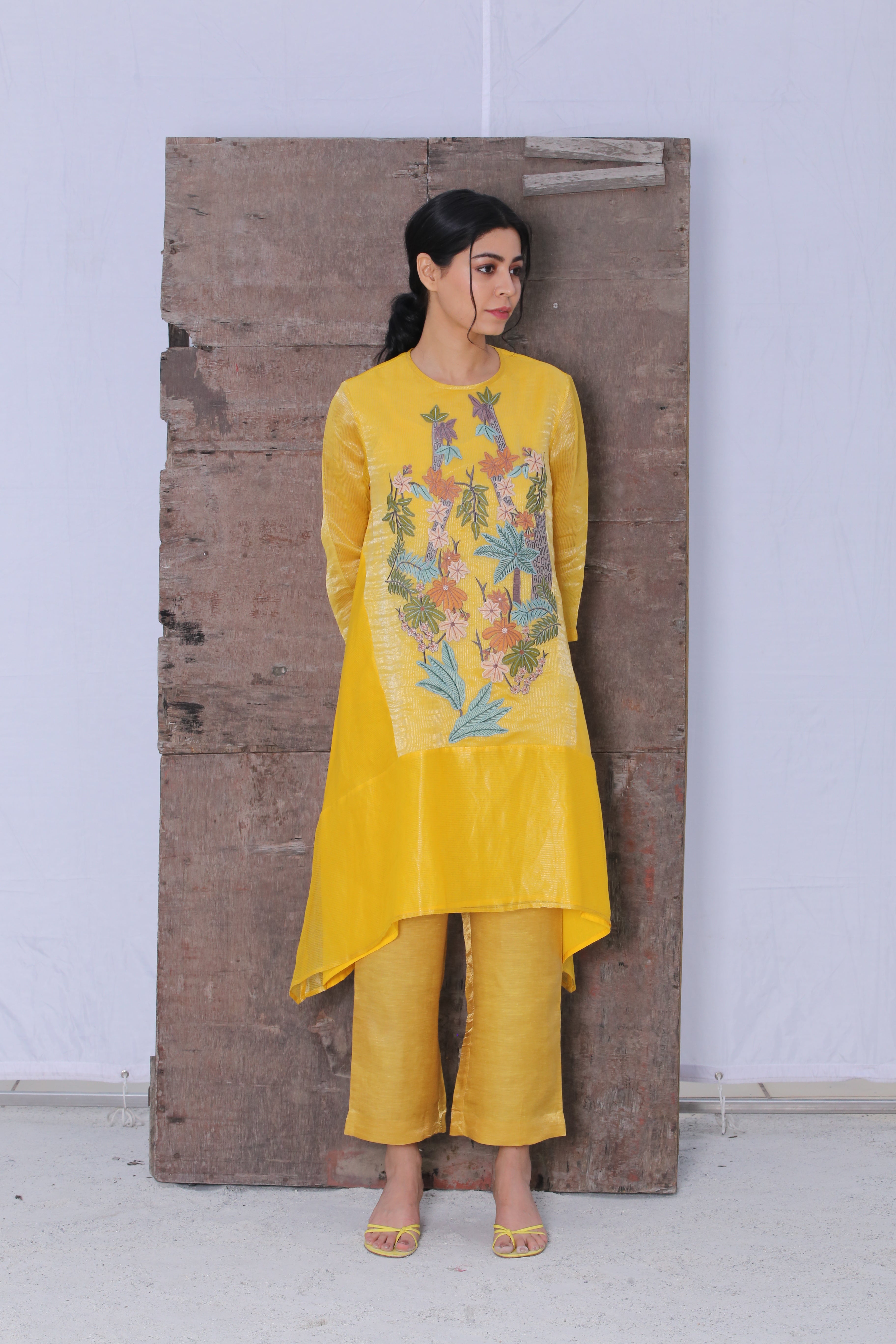 A-line applique yoke kurta set with choker neck and fish pattern lengths..