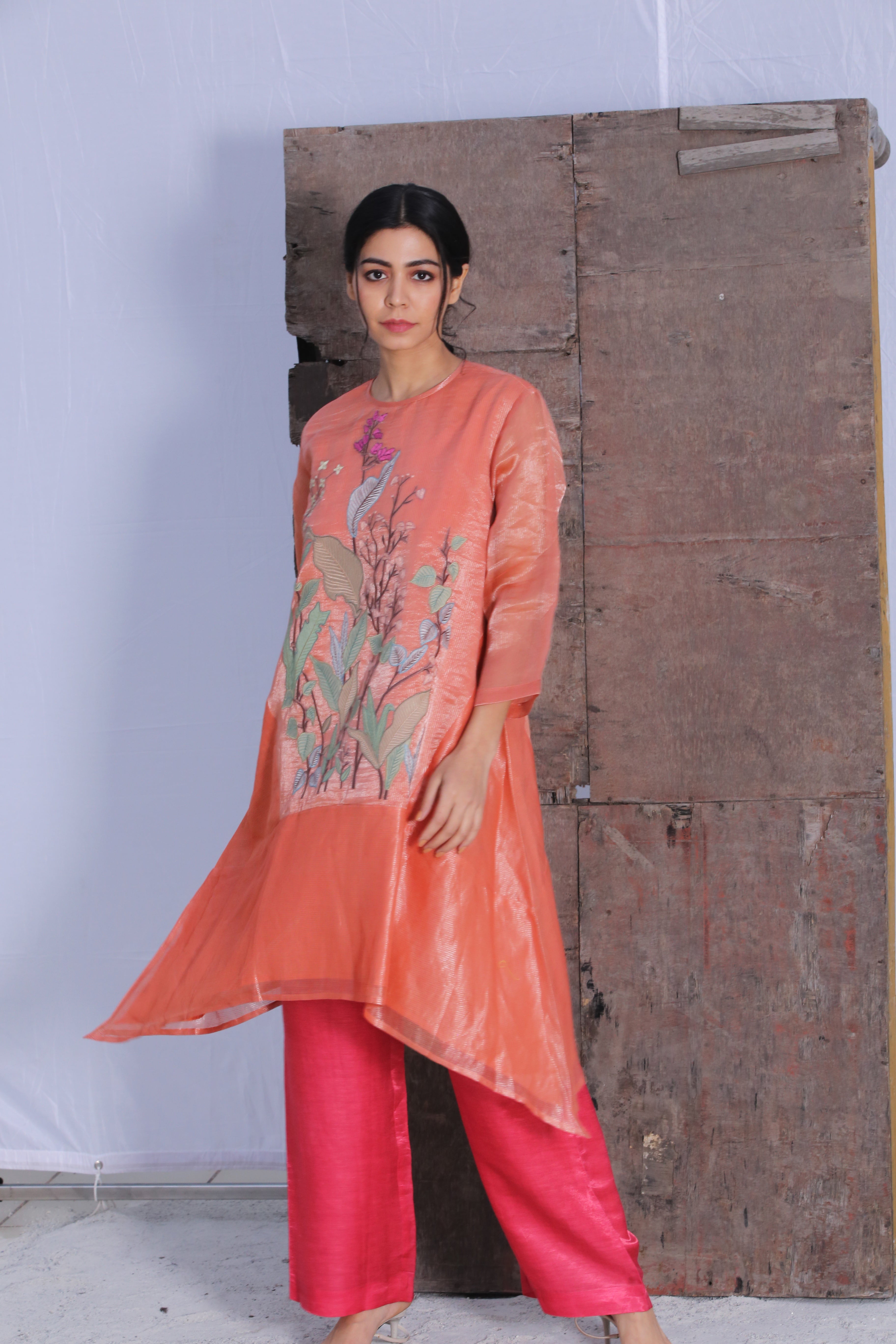 A-line applique yoke kurta set with choker neck and fish pattern at the lengths with a combination of darker hue parallels.