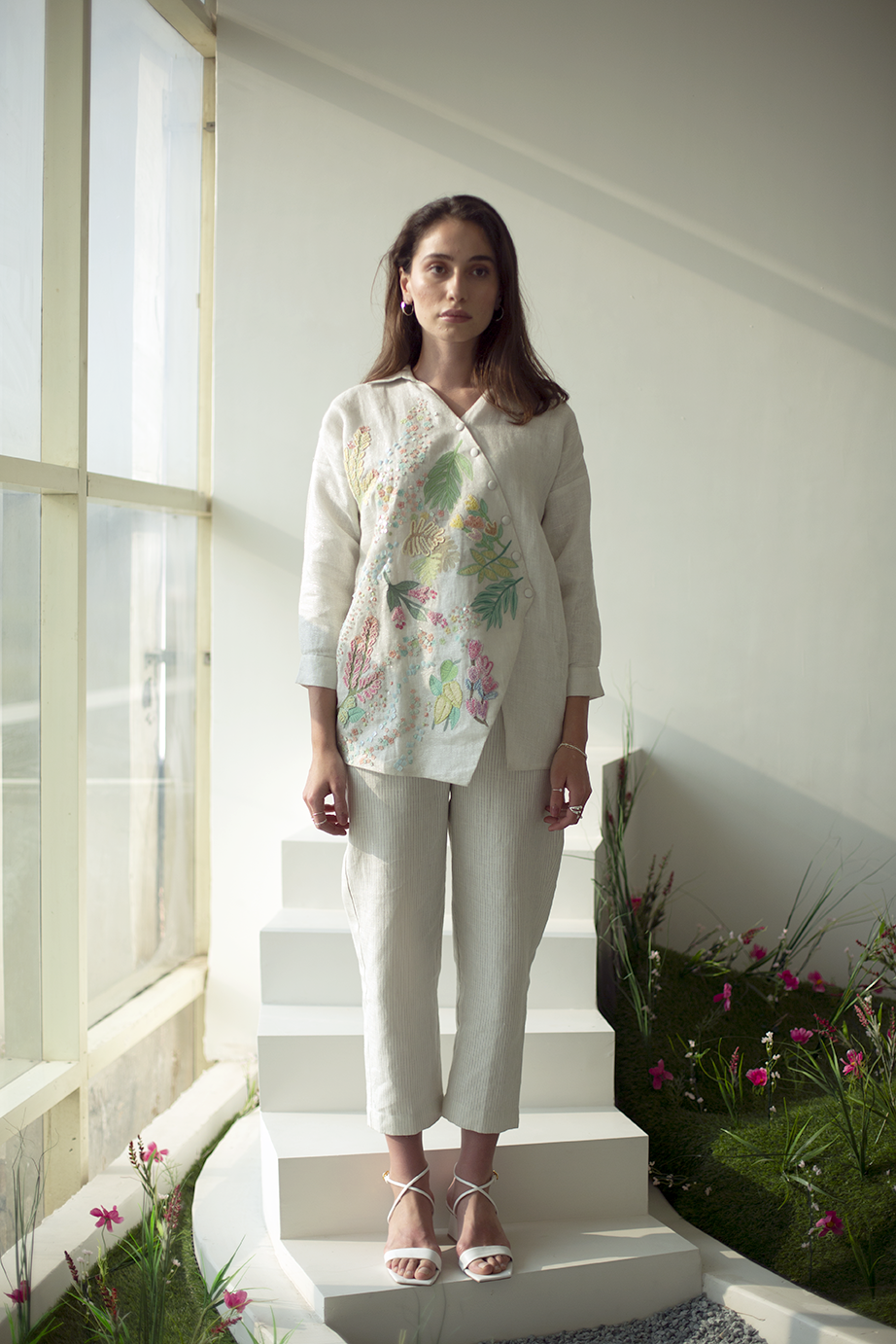 A two piece set in glint linen fabric adorned with nature inspired floral 3D embroidery paired with linen silver weave pants.