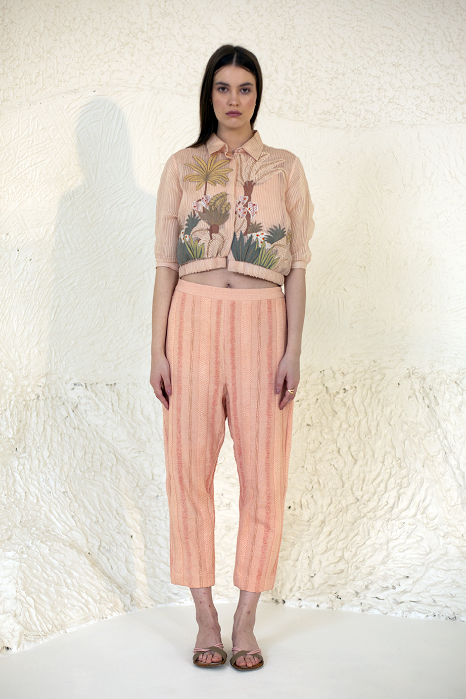 A three piece linen fletcher cropped set adorned with hand applique embroidery crafted using seven-line weaving technique paired with handloom linen pants.