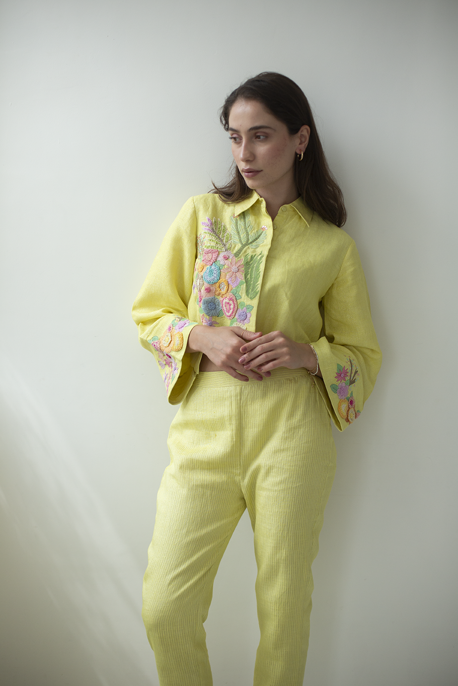 A two piece co-ord set with box sleeve top in glint linen fabric adorned with nature inspired floral 3D embroidery paired with linen silver weave pants.