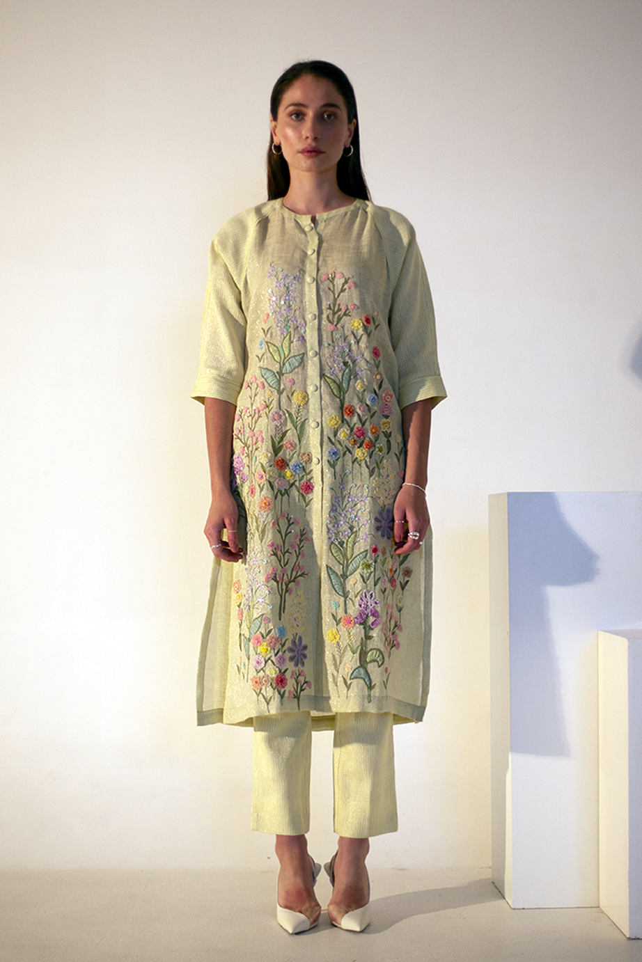A two piece set in glint linen fabric adorned with nature inspired floral 3D embroidery paired with linen silver weave pants.