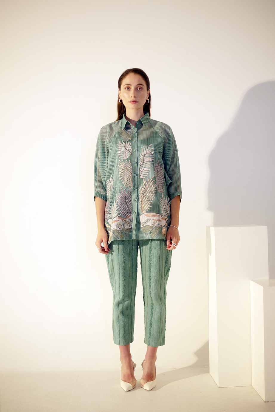 A three piece linen fletcher set in yellow adorned with embroidered leaves and tranquil lake motifs and hand applique embroidery using seven-line weaving technique paired with handloom linen pants.