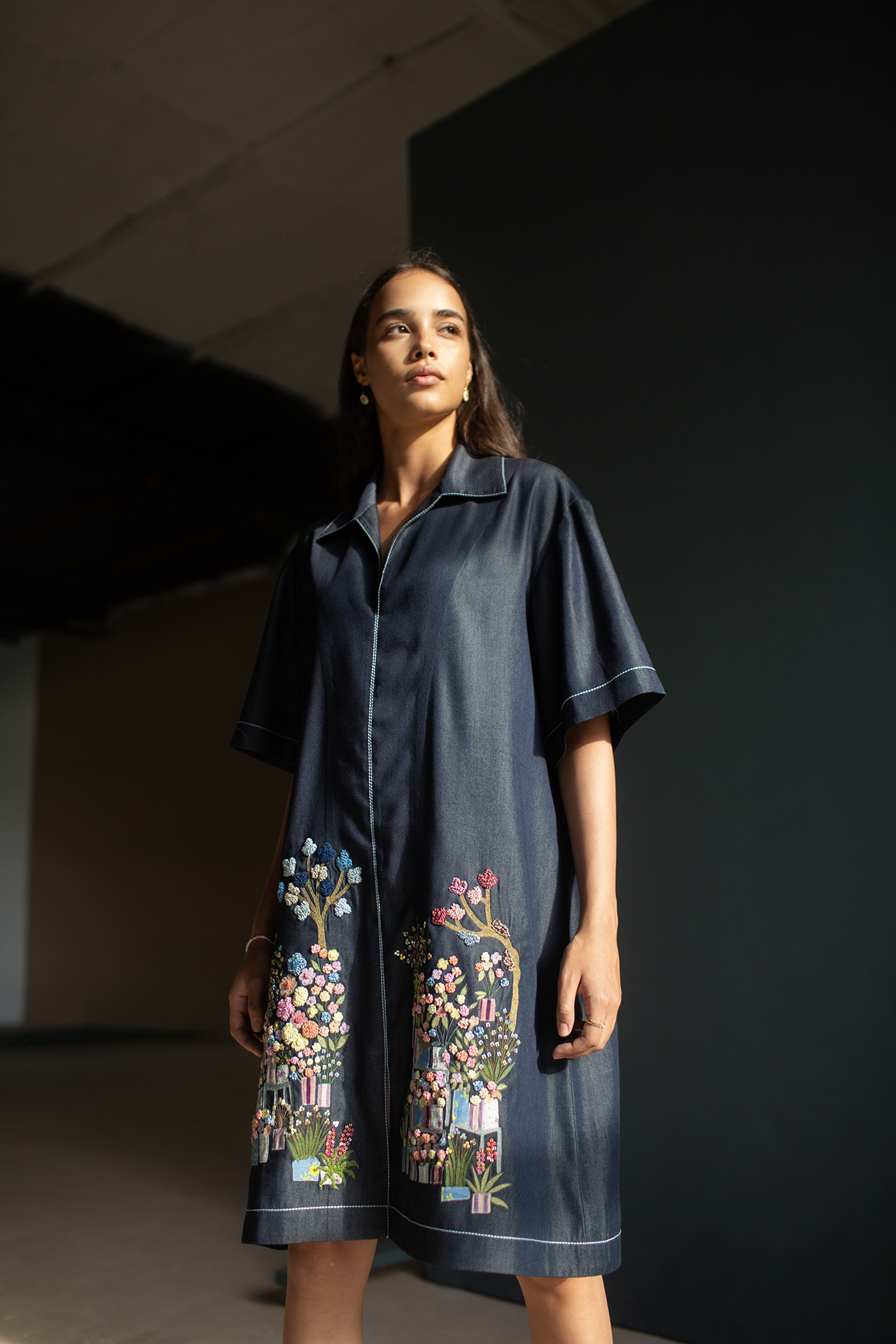 BOX FIT DENIM DRESS ADORNED WITH HAND KNOT FLORAL EMBROIDERY WITH ANCHOR DETAILING ON NECKLINE AND SLEEVES