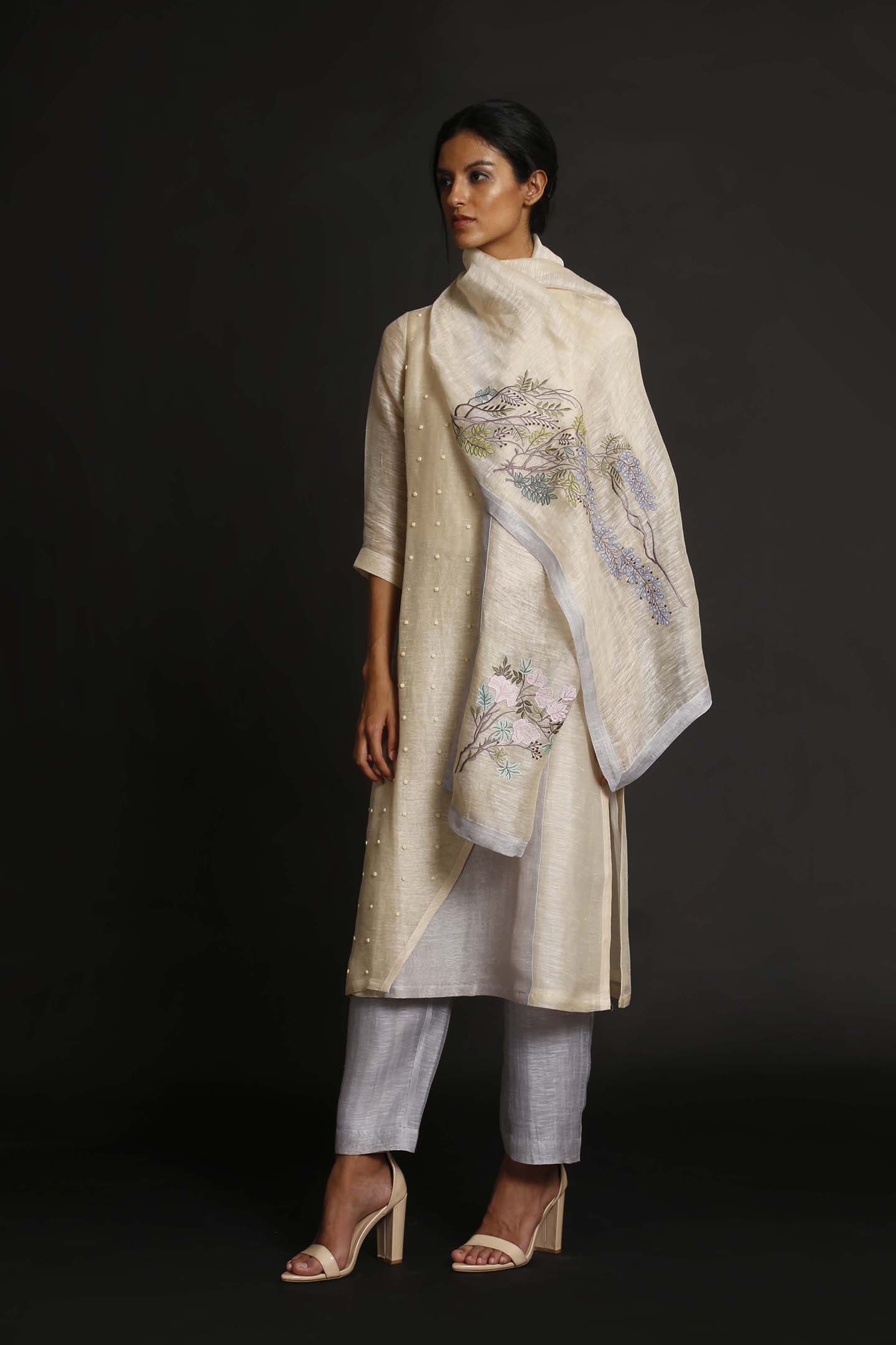 A Linen silk 3 piece set with an exotic bloom work on the dupatta.