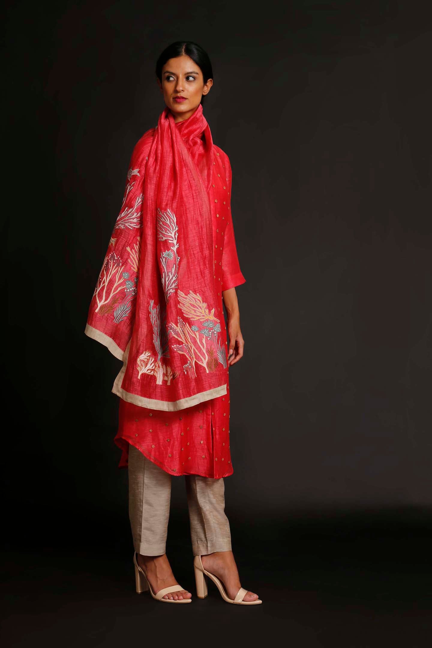 A Linen silk 3 piece set with colourful Marine embroidery on the dupatta.