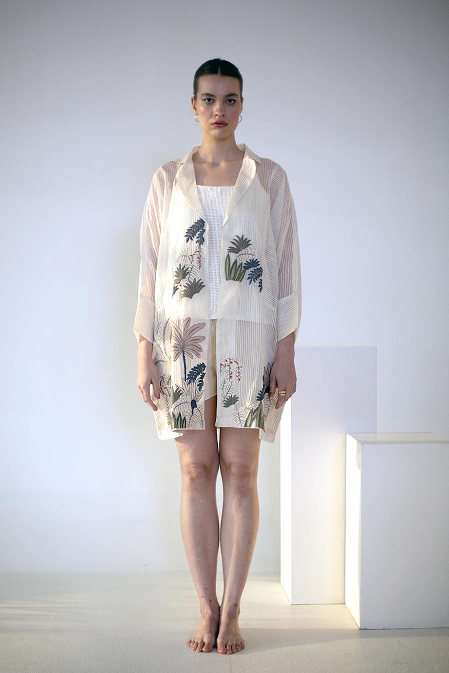 A three piece linen fletcher adorned with intricate earthy and hand applique embroidery crafted using seven-line weaving technique paired with handloom linen shorts.