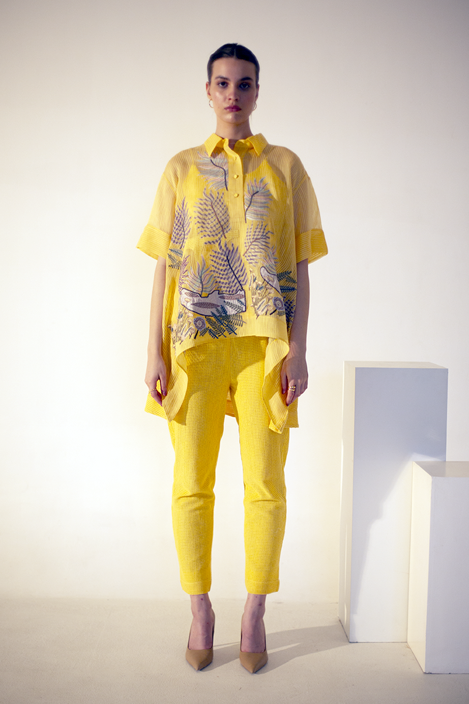 A three piece linen fletcher set in yellow adorned with intricate earthy and hand-knit appliqued embroidery crafted using seven-line weaving technique paired with knitted pants.