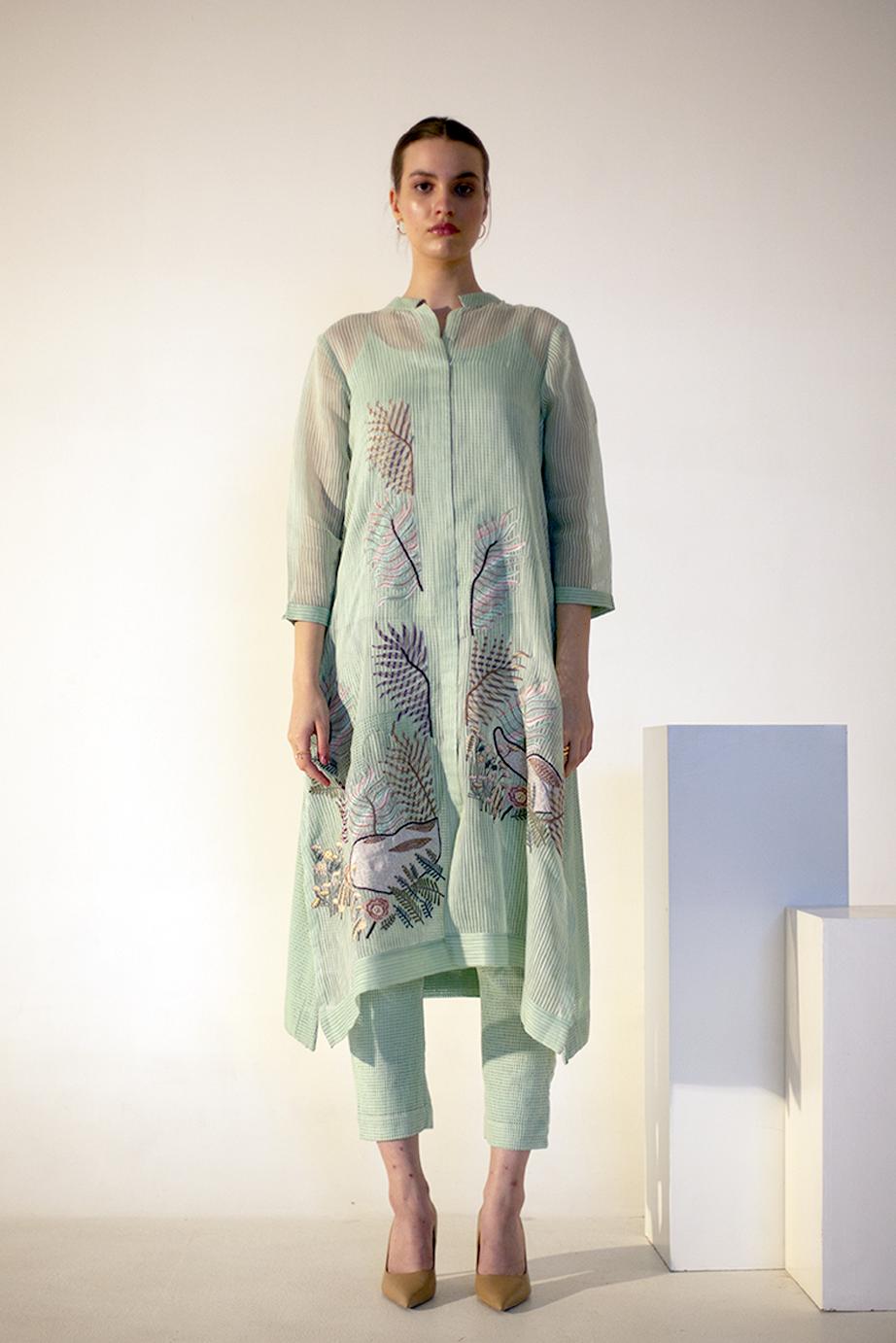 A three piece linen fletcher short jacket adorned with intricate earthy and hand applique embroidery crafted using seven-line weaving technique paired with knitted pants.
