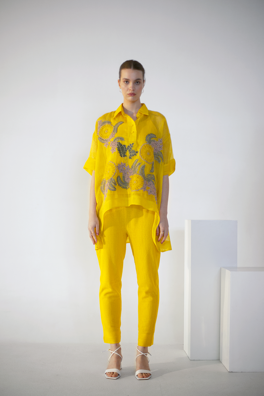 A three piece linen fletcher set in yellow adorned with intricate earthy and crochet patches crafted using seven-line weaving technique paired with knitted pants.