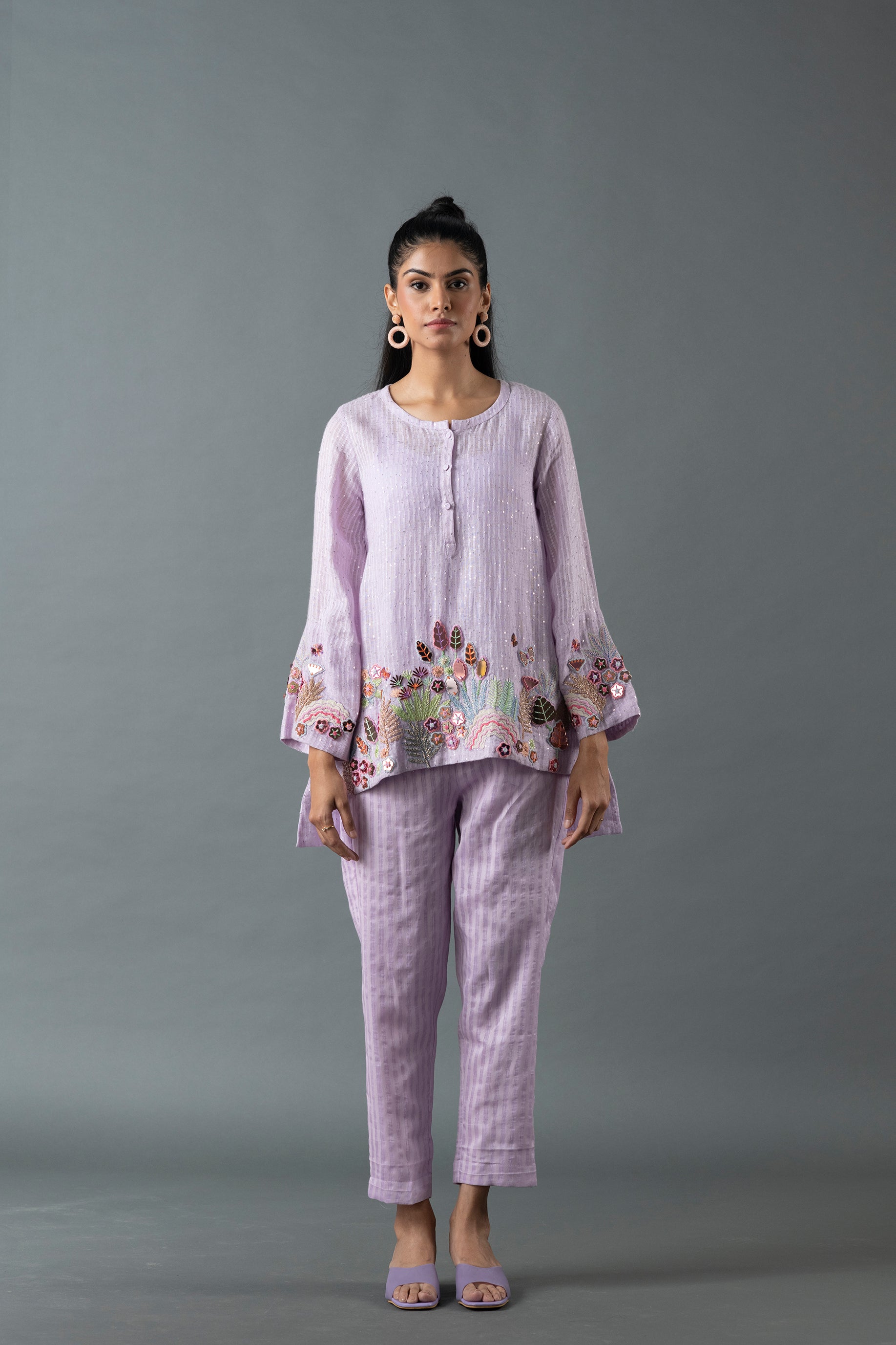 Drama on the length and the sleeves makes the outfit a perfect blend of Indian and western. Adorned with organic glass embroidery and linen fletcher pants.