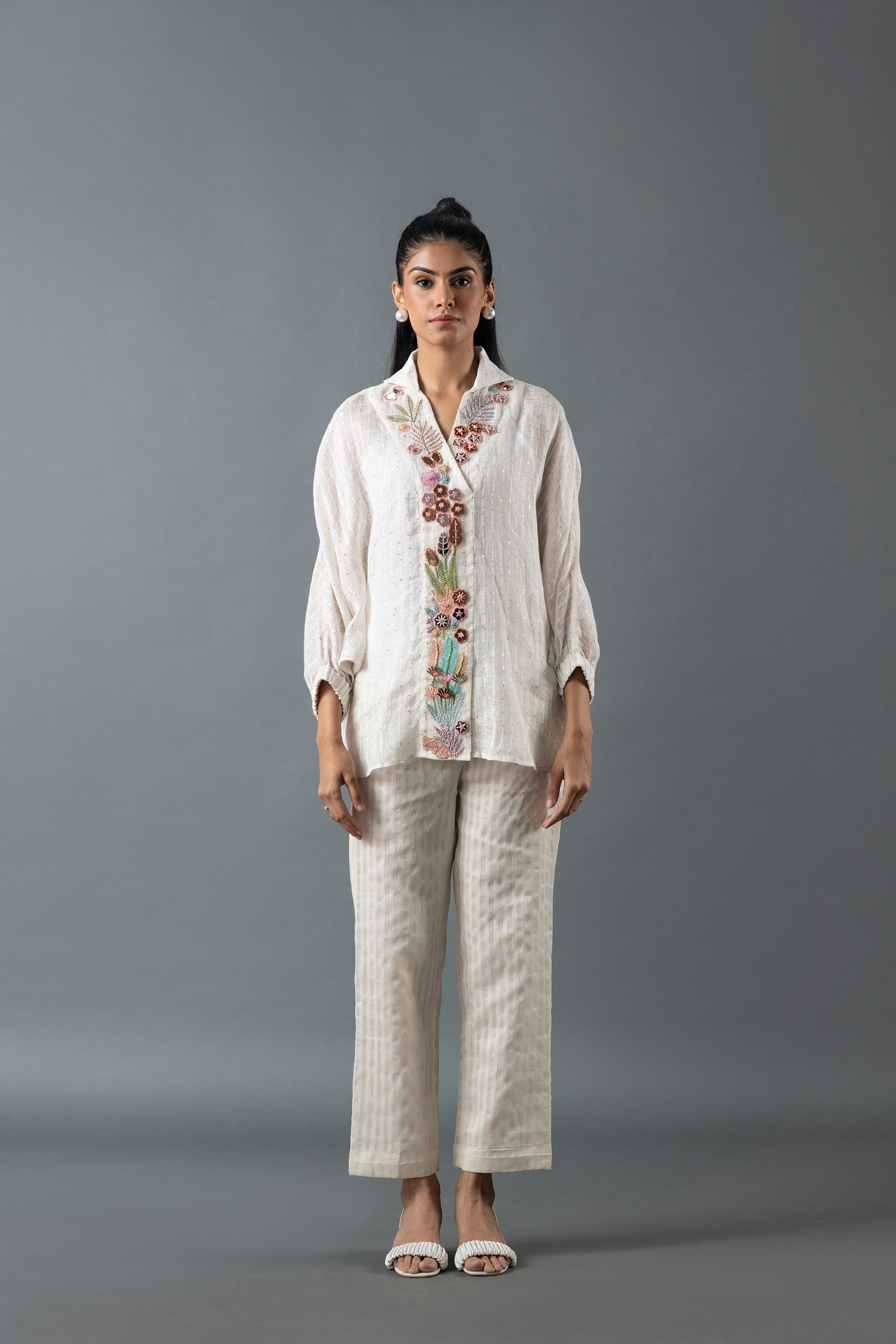 Anti-fit indo western outfit , composed with organic glass embroidery in fusion of matte and gloss. Gota hand work intricately executed on handloom sequins linen fabric; paired with linen fletcher pants.