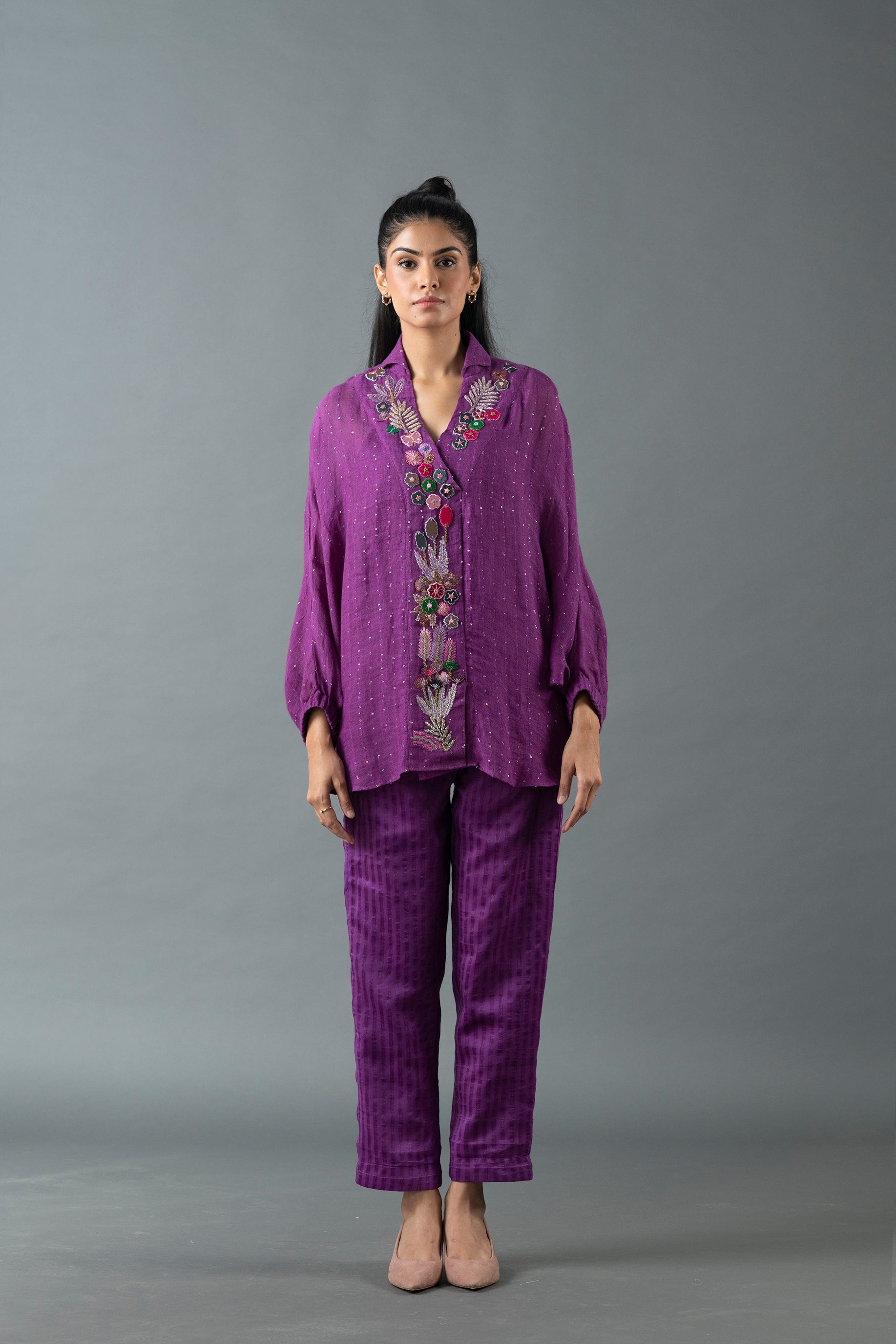 Anti-fit indo western outfit , composed with organic glass embroidery in fusion of matte and gloss. Got hand work intricately executed on handloom sequins linen fabric; paired with linen fletcher pants.