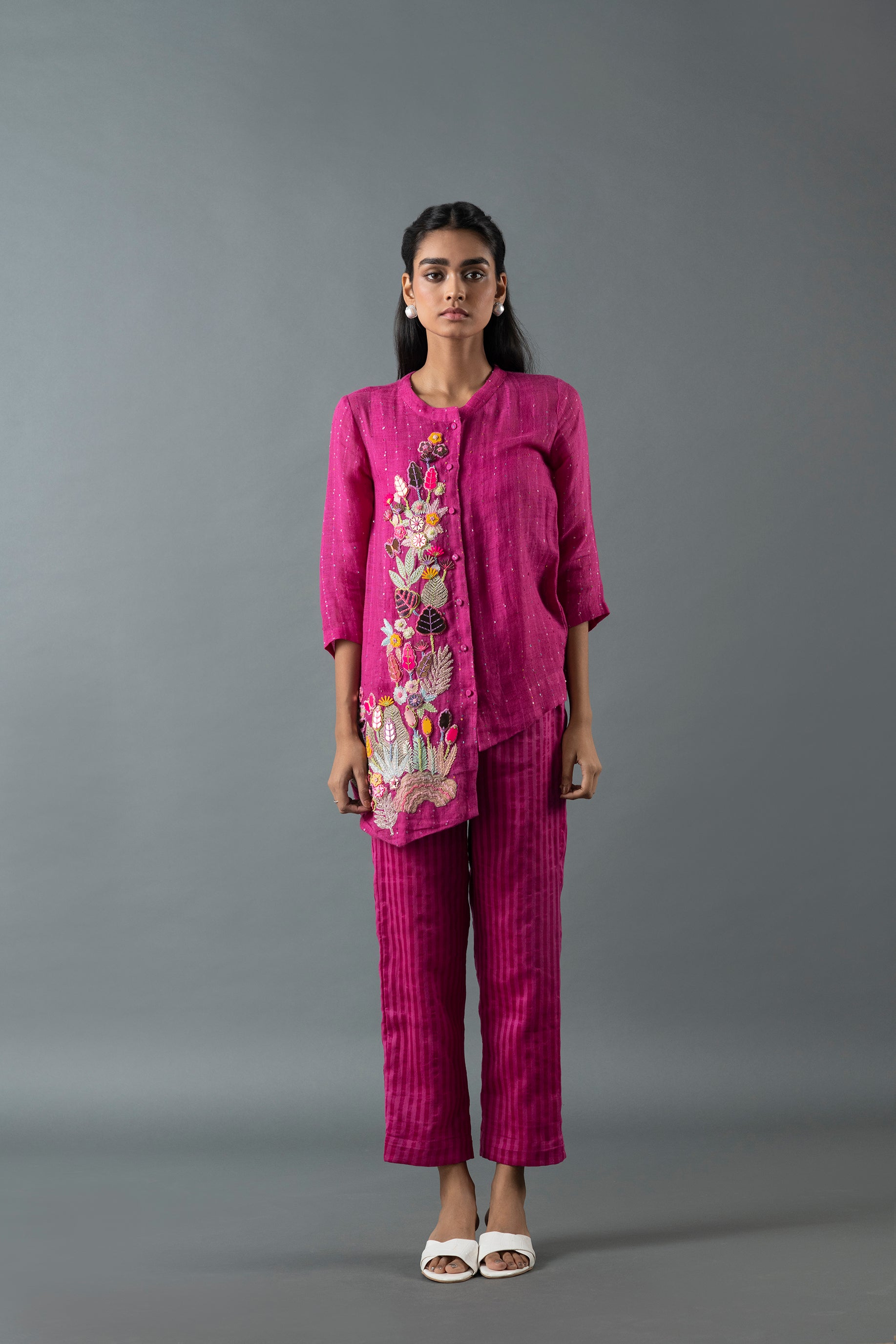 A modish asymmetric ensemble with one side elongated shirt with heavy embroidery breaking the balance! Paired with linen fletcher pants!