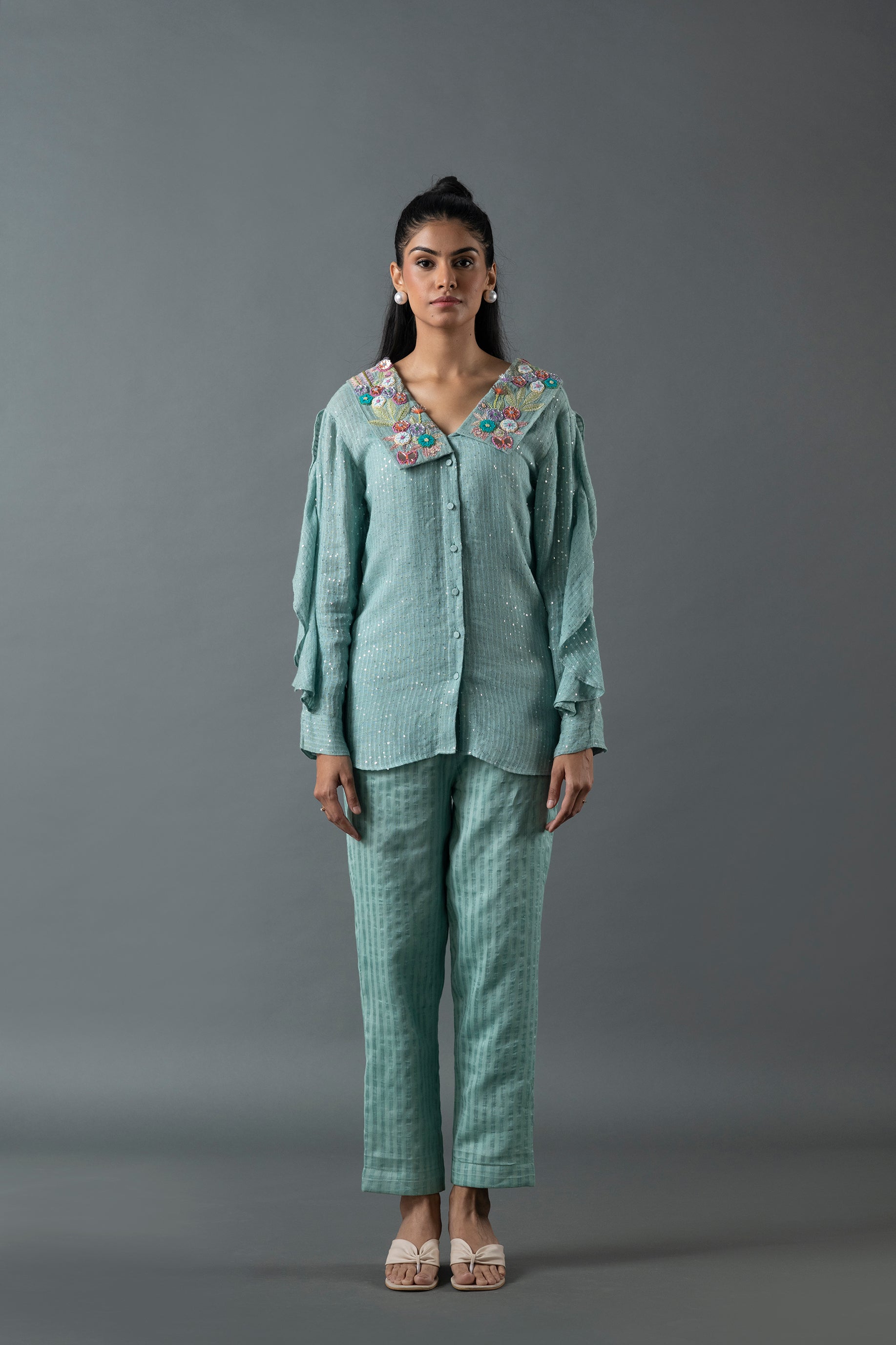 Young and frisky design with ruffles on sleeves and symmetrical neck with glass embroidery front and back