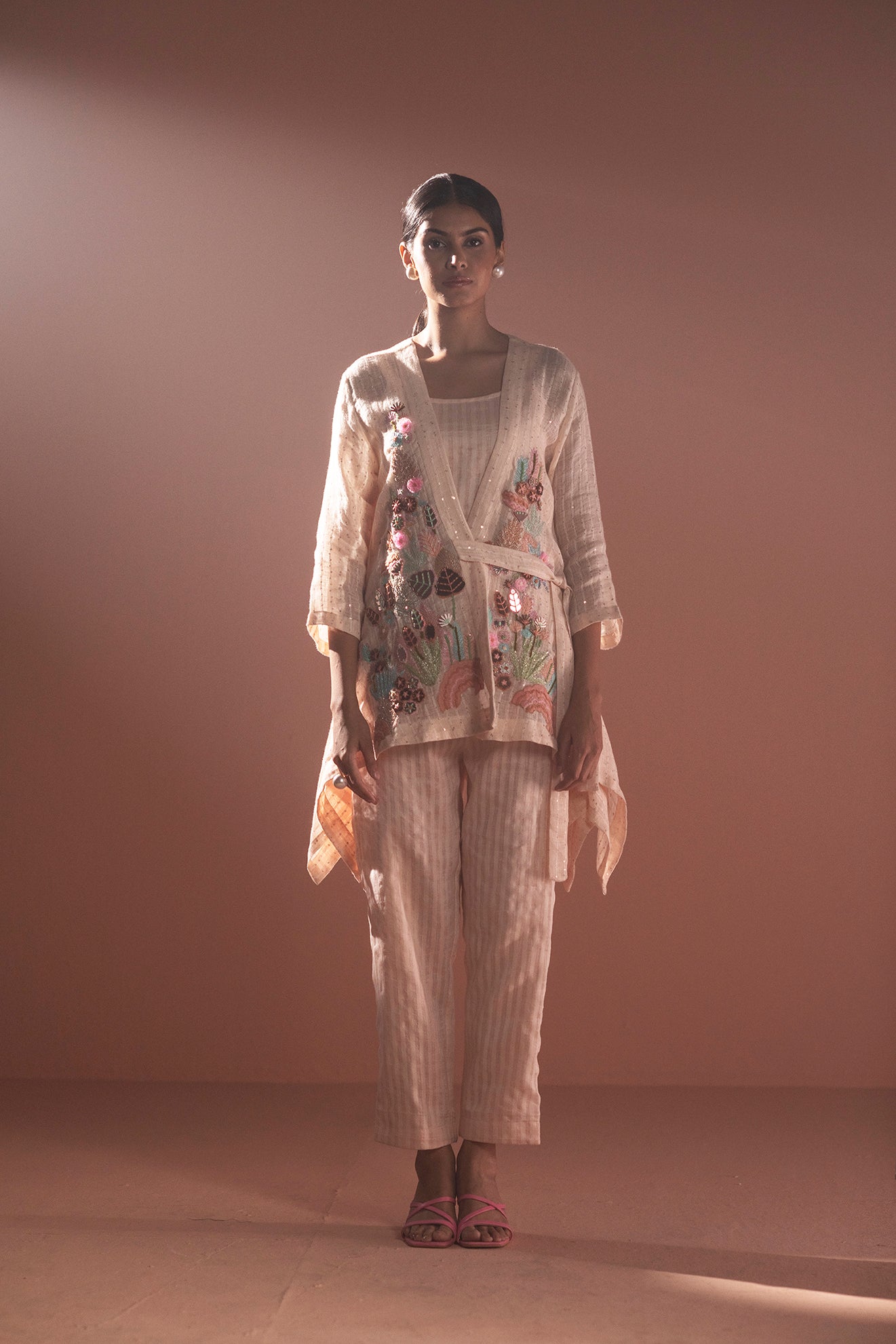 The organic glass embroidery composition gives our bestseller justice in every possible manner! Our short jacket styled with pants and inner.