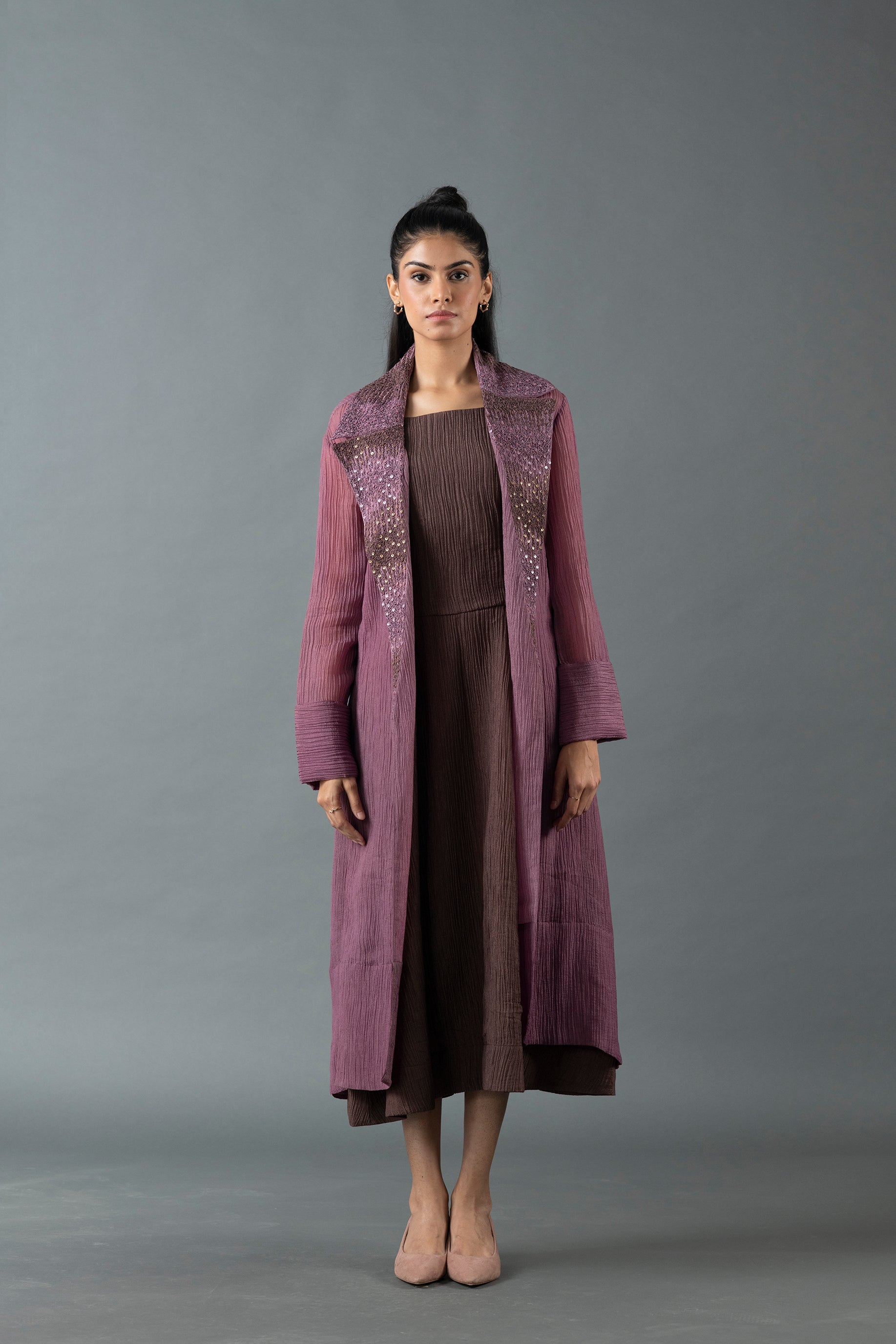 A cocktail ensemble with two colors successing each other expressed through hand embroidery adorned beautifully in the neck as a lapel paired with a slip dress inside for that oomph factor!
