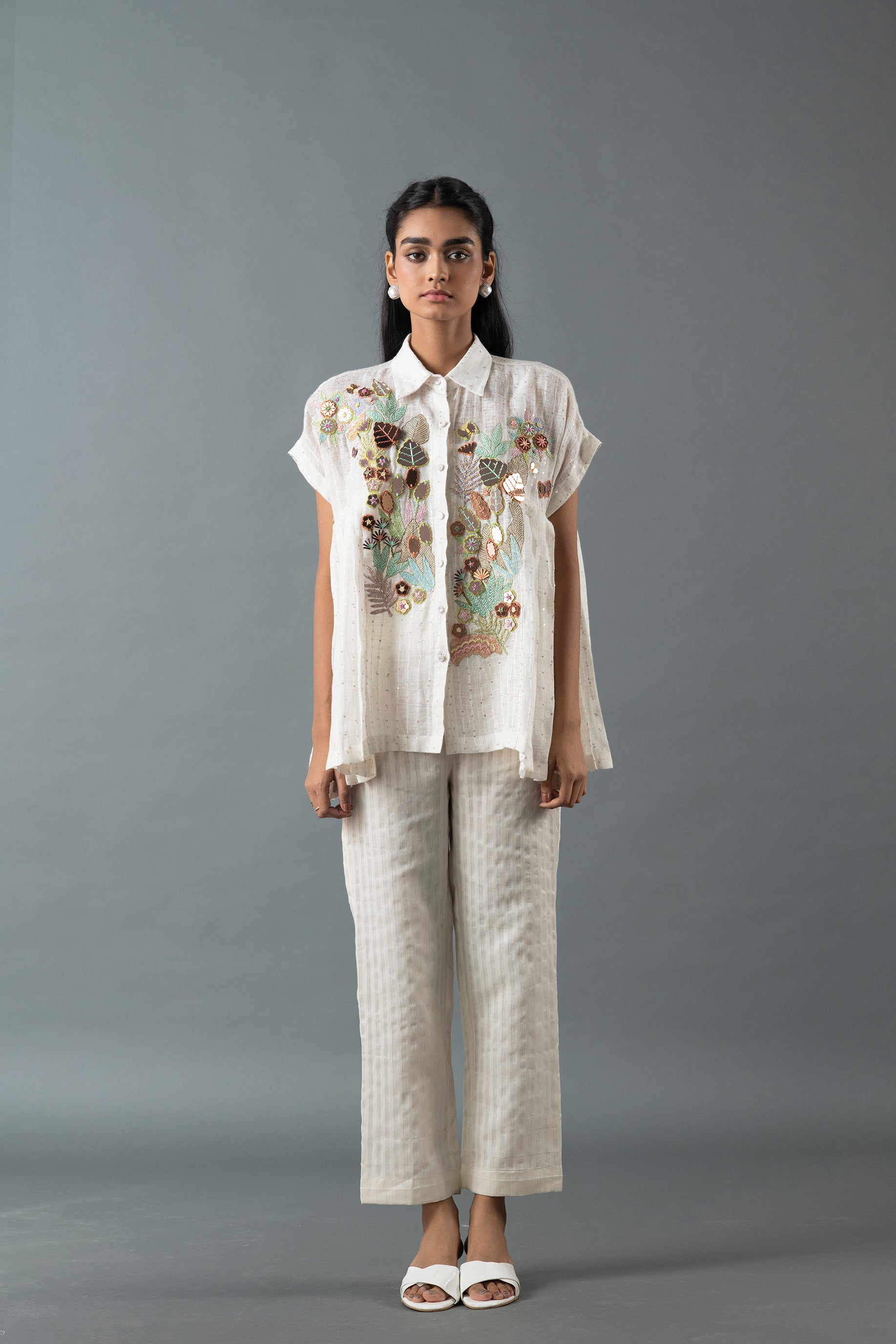 Beautifully composed embroidery of the organic glass with the pleats on the sides of the body, creating an anti fit whilst giving an illusional elongated look.