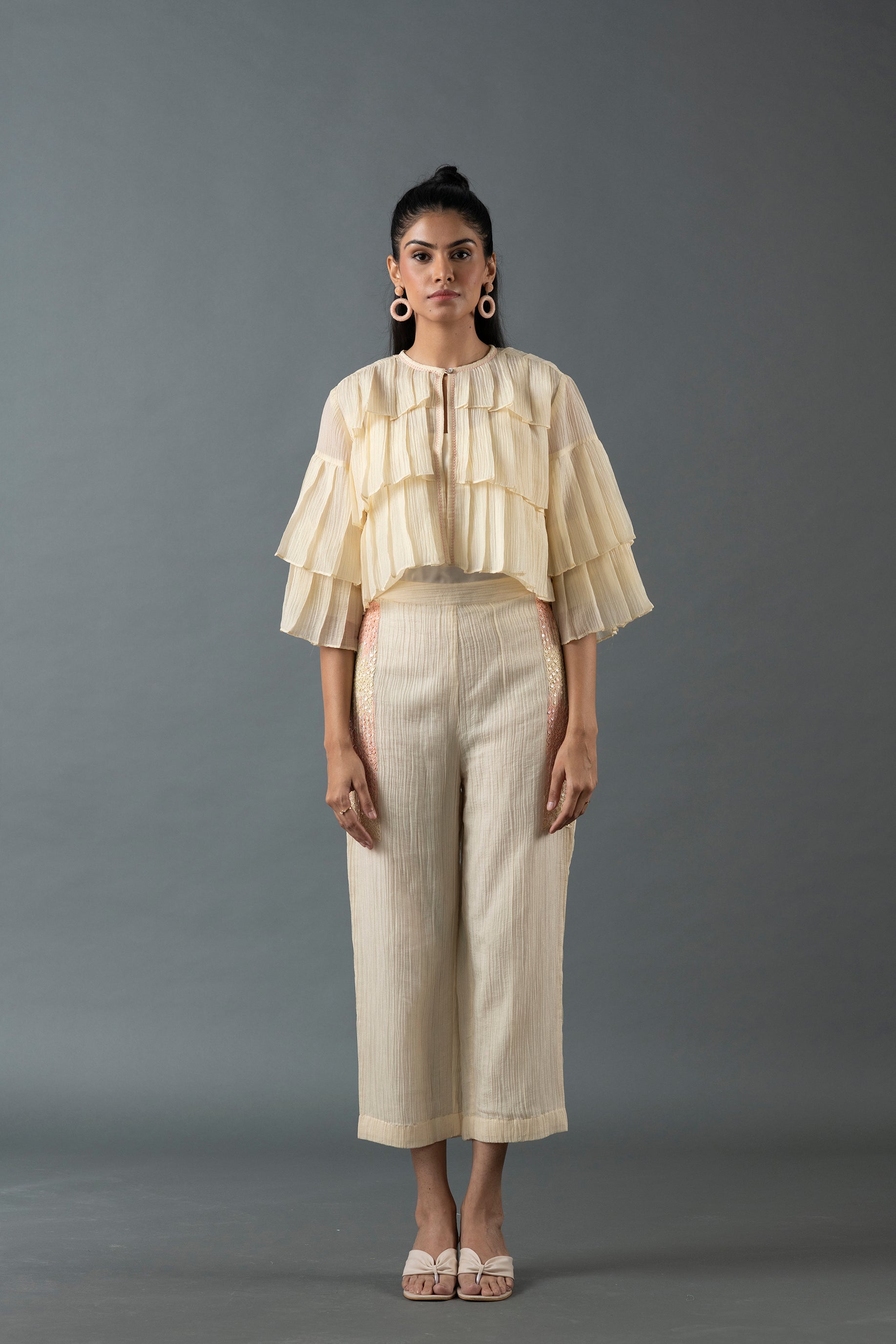 Concept of embroidery on the length of the pants with ruffle open jacket put together gives a vogue touch to the design.