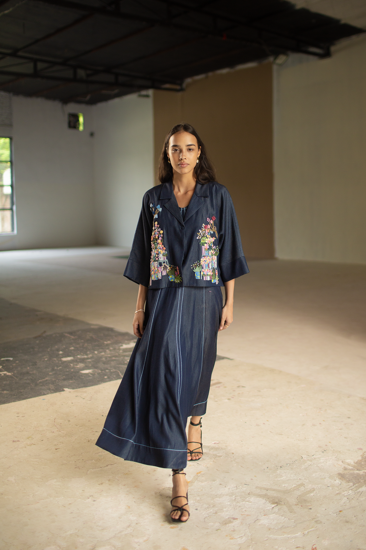 A line bustier dress with anchor detailing paired with raglan sleeve jacket with intricate hand knot embroidery