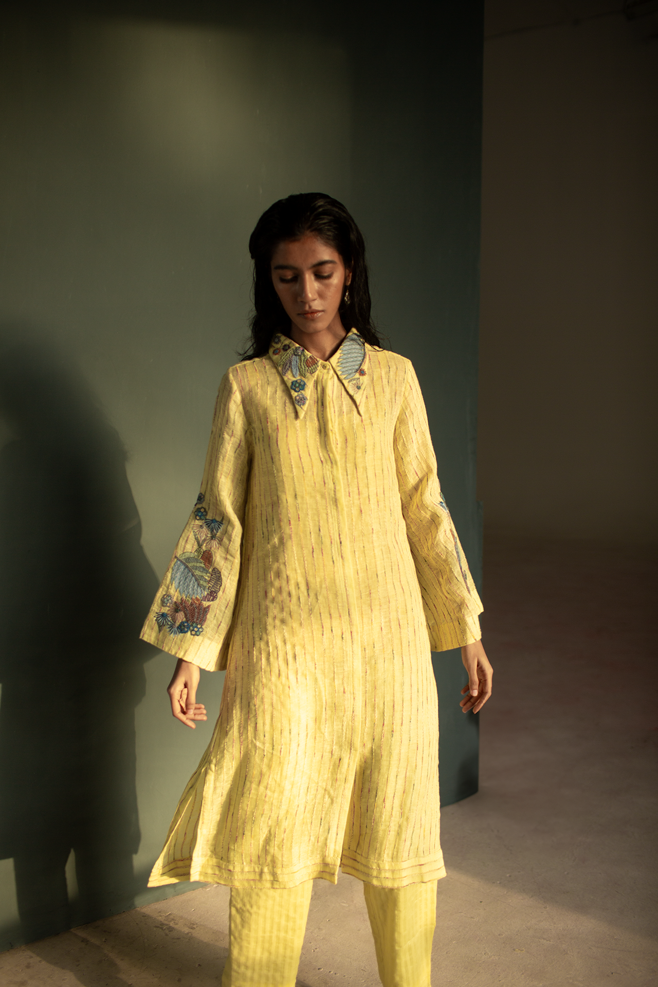 A line shirt with modern sleeves with intricate hand embroidery paired with pants and inner