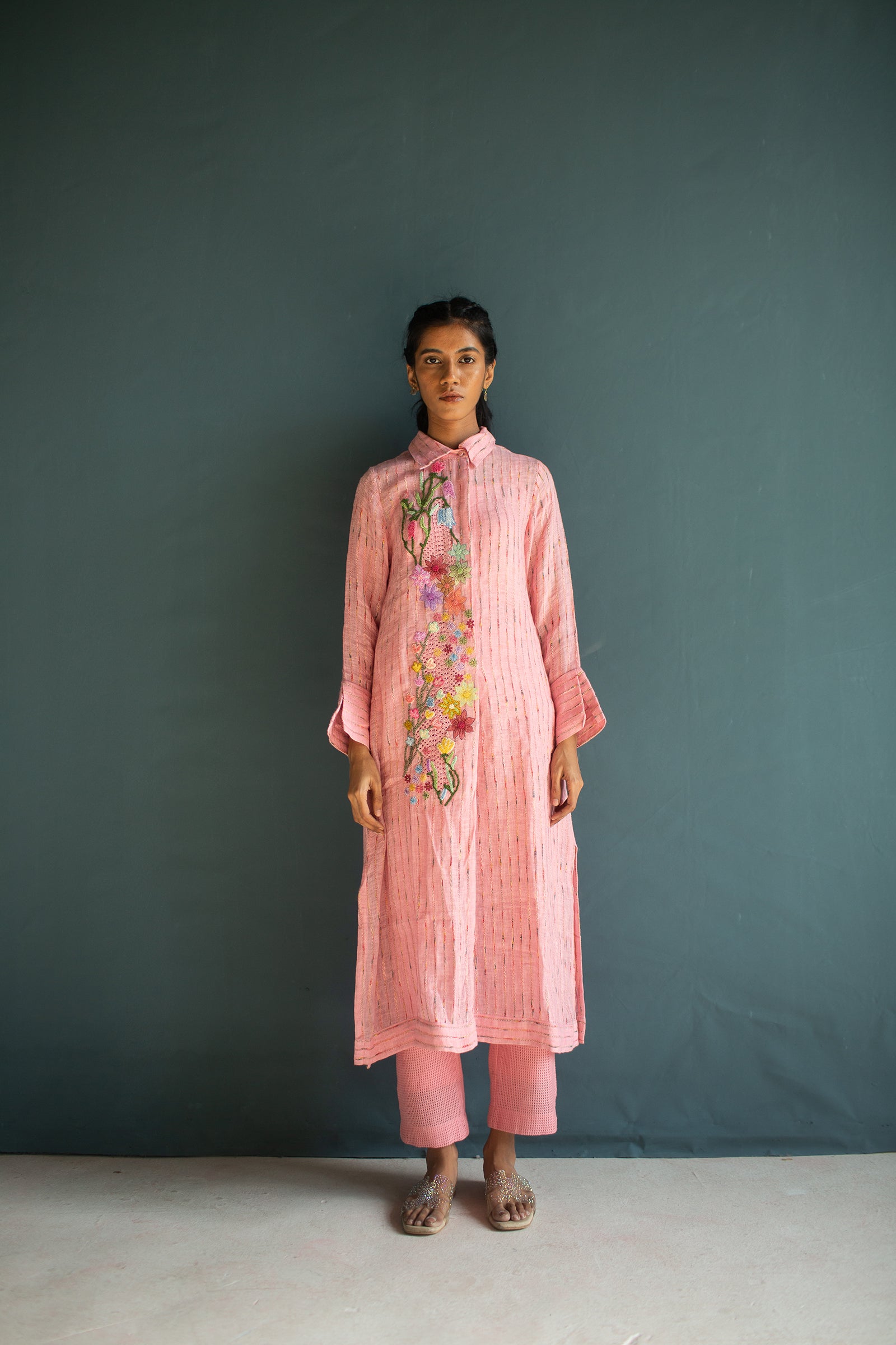 A rich silhouette delivering utmost urbanity with single side embroidery paired with pants and inner