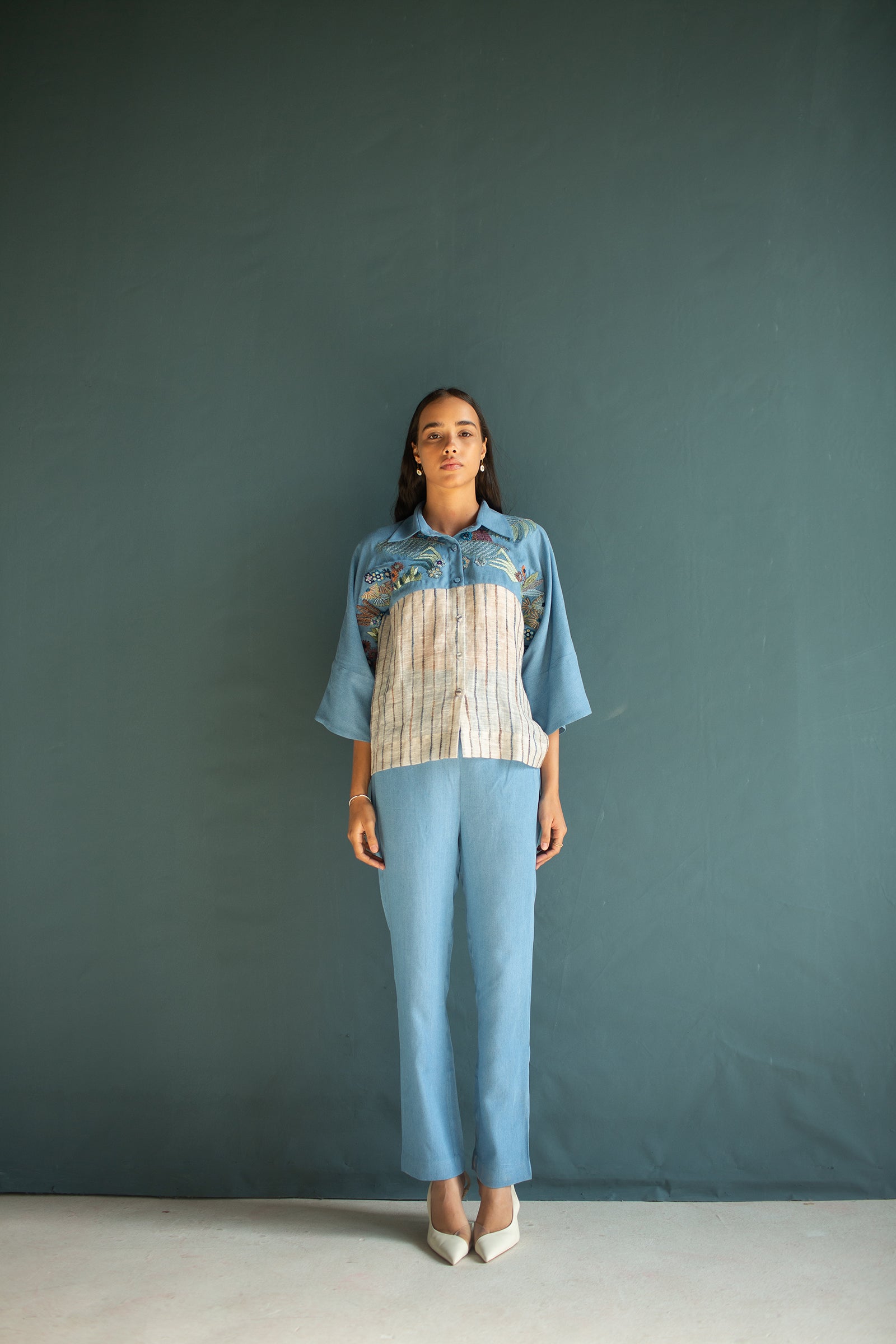 Linen and denim shirt with hand knot embroidery paired with pants