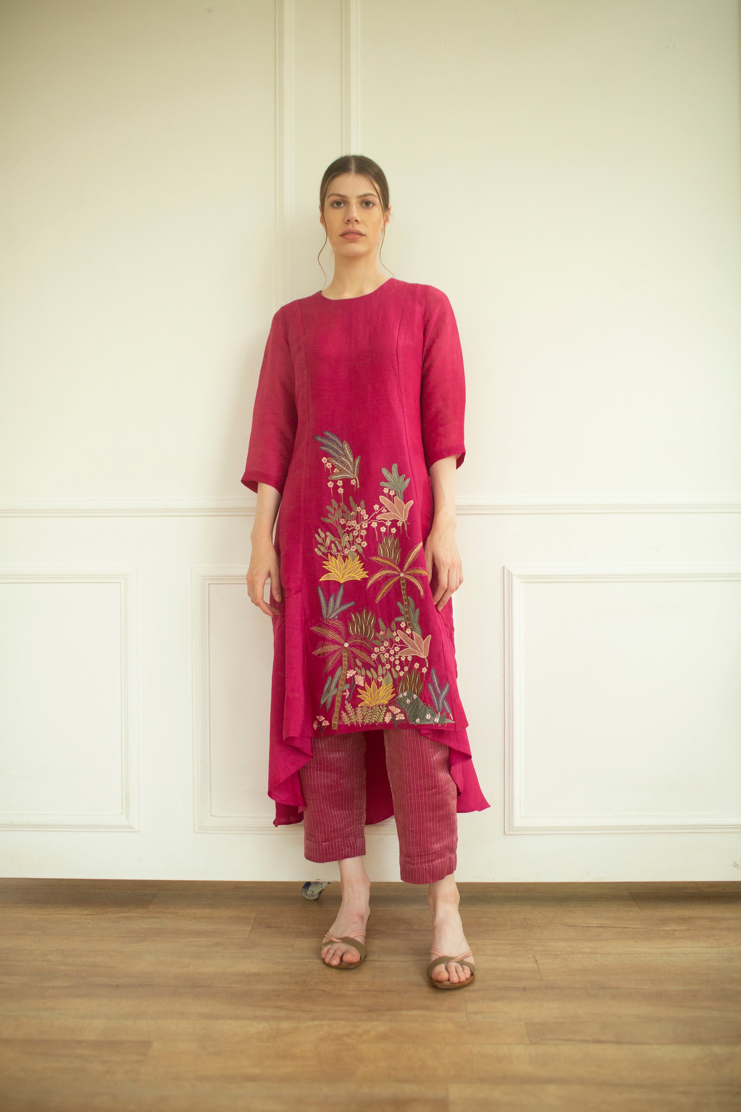 A set of two relax fit handloom linen silk tunic set with  hand applique embroidery details.